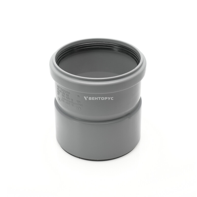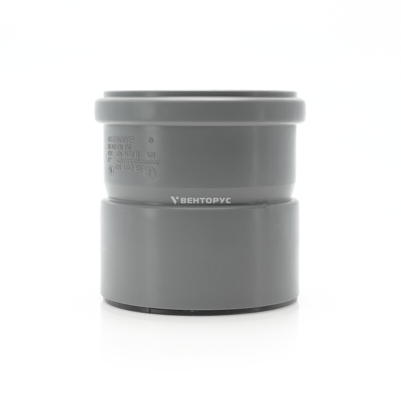 Муфта насадная с уплотнительной манжетой HTAM условным диаметром 110. Предназначена для перехода на металл - для соединения канализационных труб из ПВХ или полипропилена со стальной трубой или с чугунной безраструбной трубой SML.