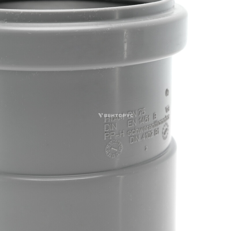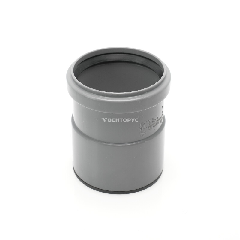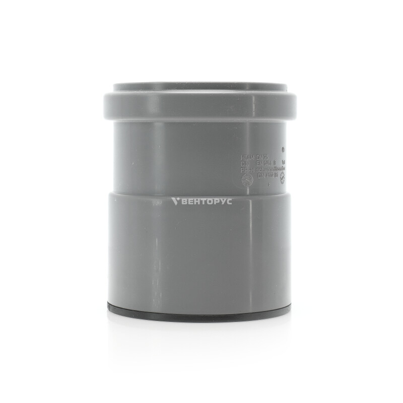Муфта насадная с уплотнительной манжетой HTAM условным диаметром 75. Предназначена для перехода на металл - для соединения канализационных труб из ПВХ или полипропилена со стальной трубой или с чугунной безраструбной трубой SML.
