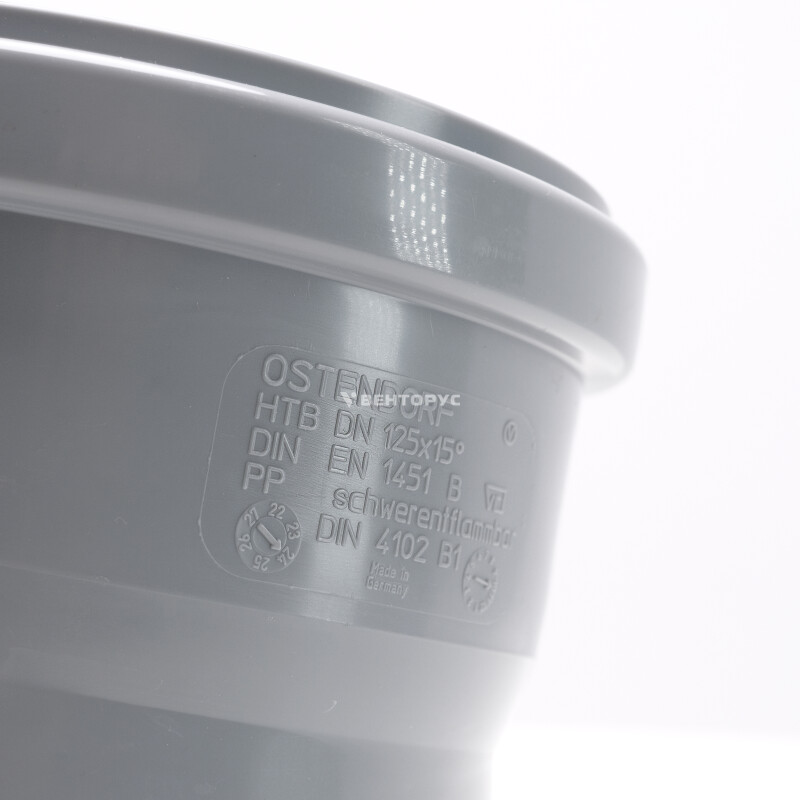 Отвод для внутренней канализации Ostendorf HTB изготовленный под углом 15° диаметром 125 мм. Предназначен для организации поворота элементов системы трубопроводов во внутренней канализации.
