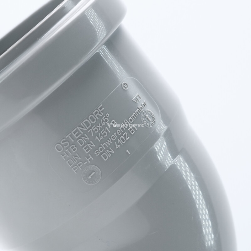 Отвод для внутренней канализации Ostendorf HTB изготовленный под углом 45° диаметром 75 мм. Предназначен для организации поворота элементов системы трубопроводов во внутренней канализации.