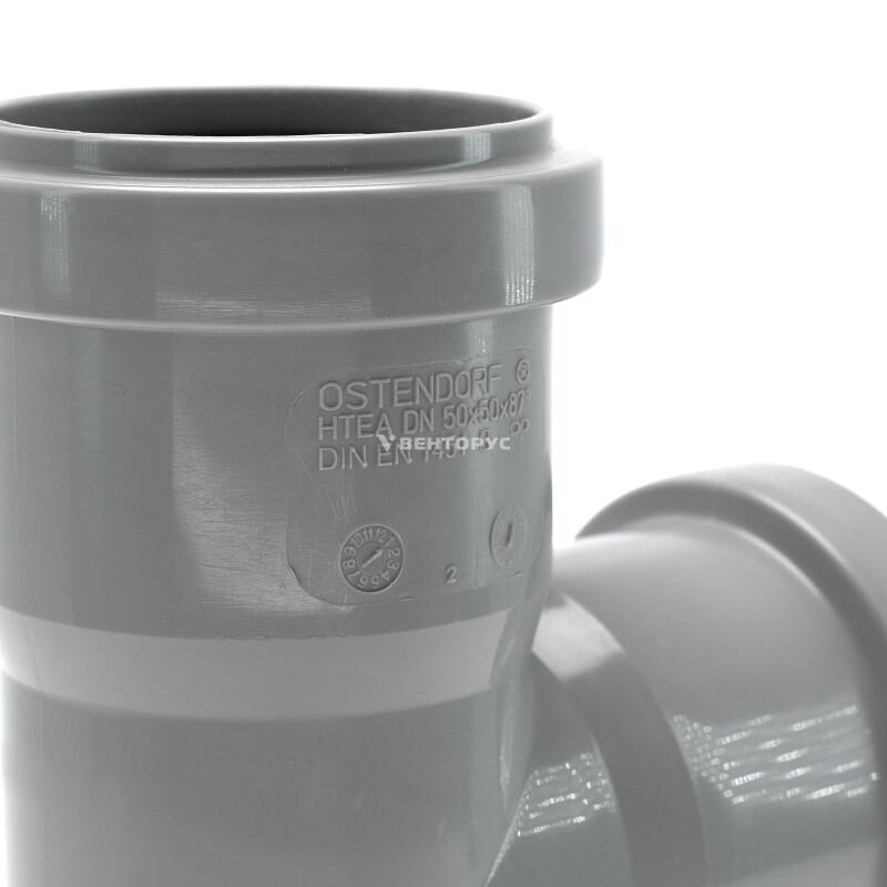 Тройник для внутренней канализации Ostendorf HTEA изготовленный под углом 87° диаметром 50x50 мм. Предназначен для монтажа разветвления трубопроводов в системах канализации внутри жилых, административных, производственных зданий, транспортирующих хозяйственно-фекальные стоки.