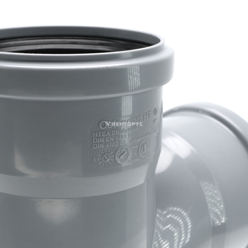 Тройник для внутренней канализации Ostendorf HTEA изготовленный под углом 87° диаметром 90x90 мм. Предназначен для монтажа разветвления трубопроводов в системах канализации внутри жилых, административных, производственных зданий, транспортирующих хозяйственно-фекальные стоки.