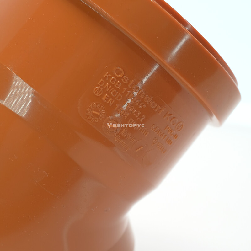 Отвод двухраструбный для наружней канализации Ostendorf KGBD 2М изготовленный под углом 45° диаметром 110 мм. Предназначен для организации поворота элементов системы трубопроводов наружной канализации под углом 45°. Цвет Оранжево-коричневый RAL 8023.