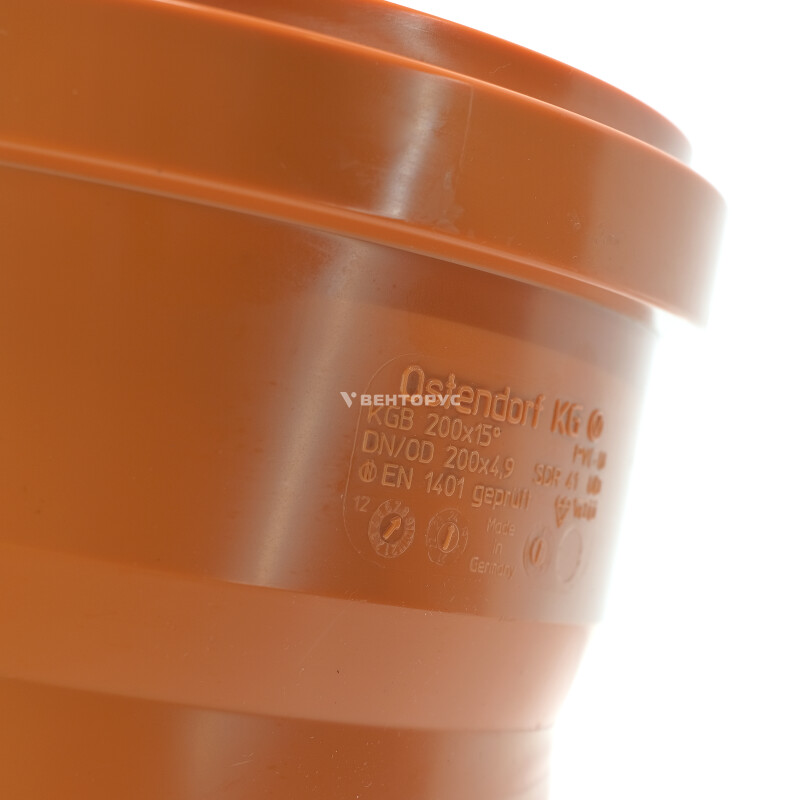 Отвод для наружной канализации Ostendorf KGB диаметром 200 мм, изготовленный под углом 15°. Предназначен для организации поворота элементов системы трубопроводов наружной канализации под углом 15°. Цвет Оранжево-коричневый RAL 8023.