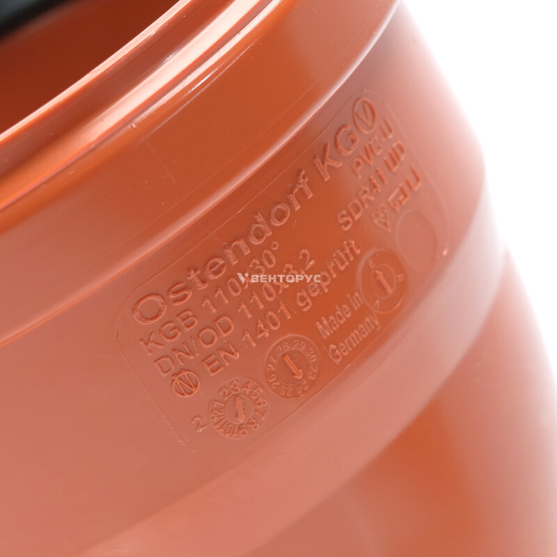 Отвод для наружной канализации Ostendorf KGB диаметром 110 мм, изготовленный под углом 30°. Предназначен для организации поворота элементов системы трубопроводов наружной канализации под углом 30°. Цвет Оранжево-коричневый RAL 8023.
