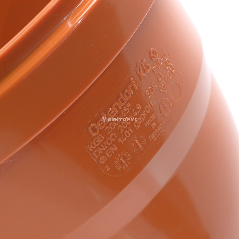 Отвод для наружной канализации Ostendorf KGB диаметром 200 мм, изготовленный под углом 45°. Предназначен для организации поворота элементов системы трубопроводов наружной канализации под углом 45°. Цвет Оранжево-коричневый RAL 8023.