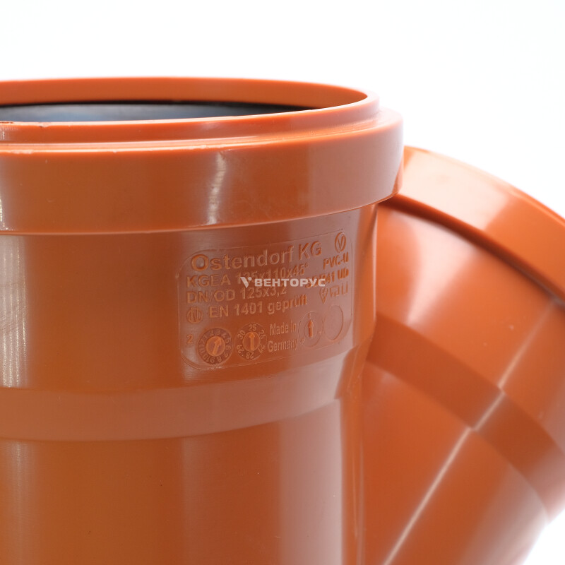 Тройник для наружной канализации Ostendorf KGEA диаметром 125x110x125, изготовленный под углом 45°. Предназначен для монтажа разветвления трубопроводов в системах канализации внутри жилых, административных, производственных зданий, транспортирующих хозяйственно-фекальные стоки.
