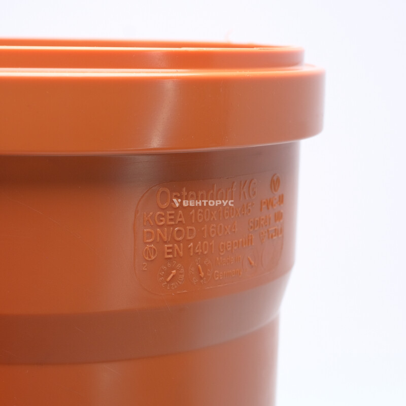 Тройник для наружной канализации Ostendorf KGEA диаметром 160x160x160, изготовленный под углом 45°. Предназначен для монтажа разветвления трубопроводов в системах канализации внутри жилых, административных, производственных зданий, транспортирующих хозяйственно-фекальные стоки.
