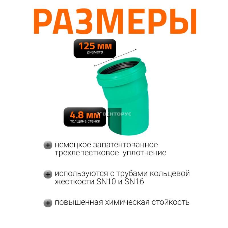 Отвод для усиленной наружной канализации марки Ostendorf KG2000B диаметром 125 мм изготовленный под углом 15°. Предназначен для организации поворота элементов системы трубопроводов наружной канализации под углом 15°. Цвет зеленый RAL 6017.