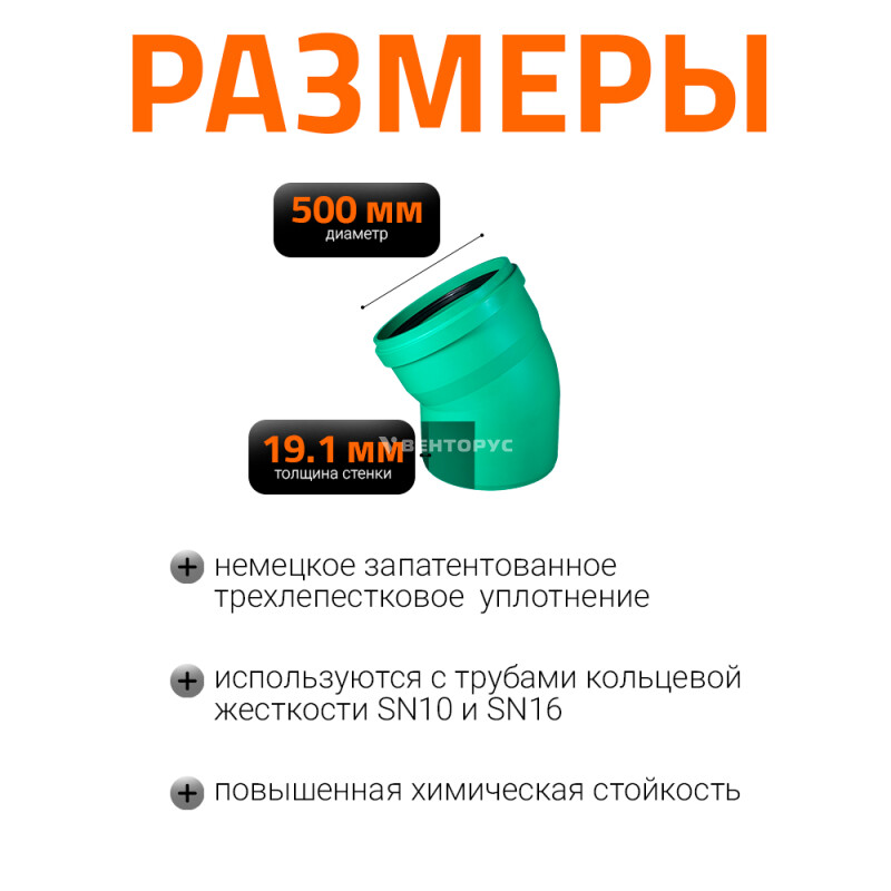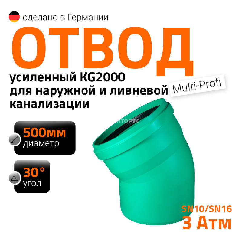 Отвод для усиленной наружной канализации марки Ostendorf KG2000B диаметром 500 мм изготовленный под углом 30°. Предназначен для организации поворота элементов системы трубопроводов наружной канализации под углом 30°. Цвет зеленый RAL 6017.