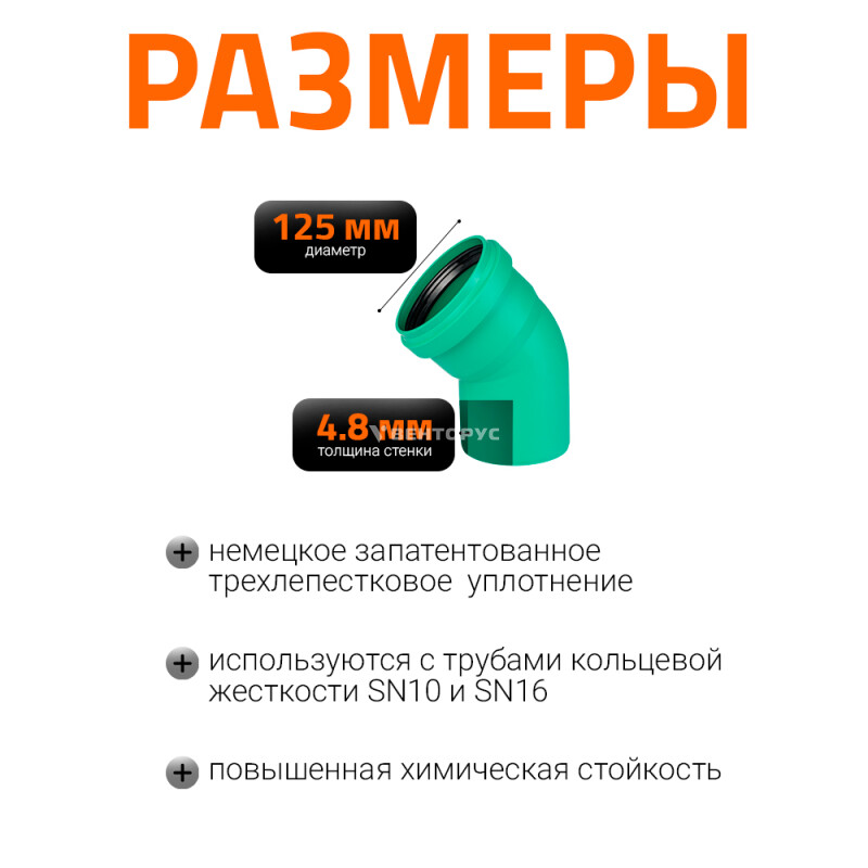 Отвод для усиленной наружной канализации марки Ostendorf KG2000B диаметром 125 мм изготовленный под углом 45°. Предназначен для организации поворота элементов системы трубопроводов наружной канализации под углом 45°. Цвет зеленый RAL 6017.