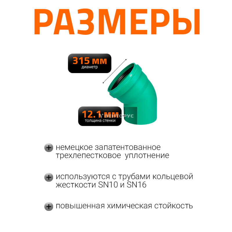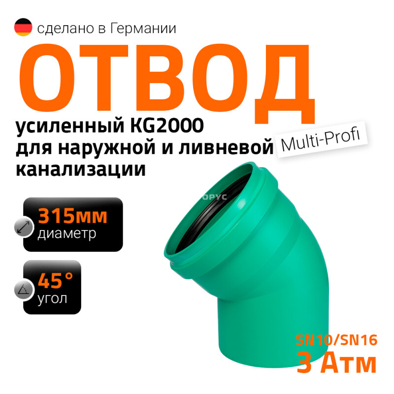 Отвод для усиленной наружной канализации марки Ostendorf KG2000B диаметром 315 мм изготовленный под углом 45°. Предназначен для организации поворота элементов системы трубопроводов наружной канализации под углом 45°. Цвет зеленый RAL 6017.