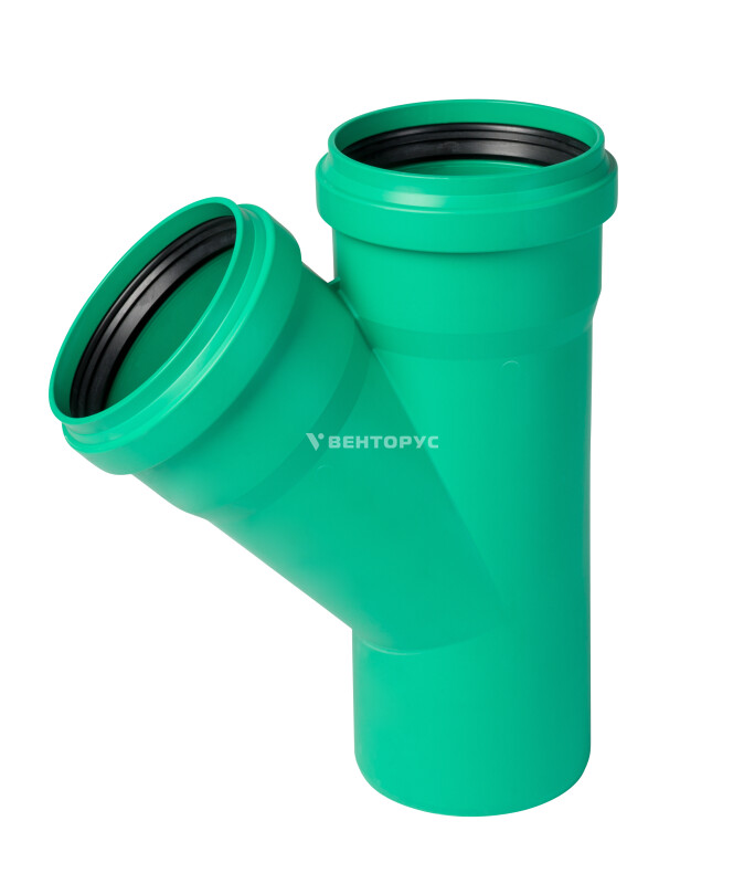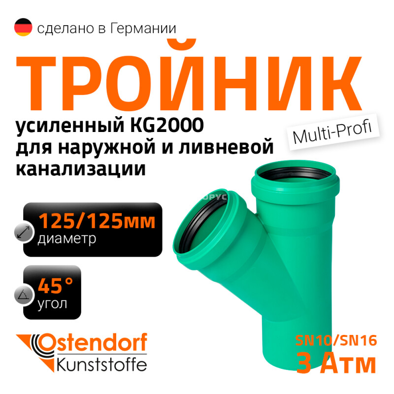 Тройник для усиленной наружной канализации Ostendorf KG2000EA диаметром 125х125x125 мм изготовленный под углом 45°. Предназначен для монтажа разветвления трубопроводов в системах канализации внутри жилых, административных, производственных зданий, транспортирующих хозяйственно-фекальные стоки. Цвет зеленый RAL 6017.