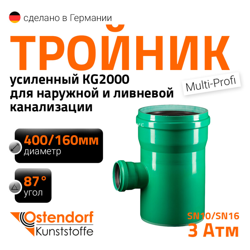 Тройник для усиленной наружной канализации Ostendorf KG2000EA диаметром 400х160x400 мм изготовленный под углом 87°. Предназначен для монтажа разветвления трубопроводов в системах канализации внутри жилых, административных, производственных зданий, транспортирующих хозяйственно-фекальные стоки. Цвет зеленый RAL 6017.