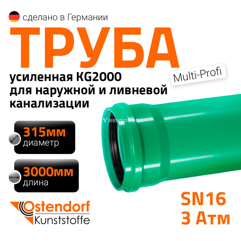 Труба для усиленной наружной канализации марки Ostendorf KG2000EM с кольцевой жесткостью SN16 (3 атм) диаметром 315, толщиной 12,1 и длиной 3000 мм. Предназначена для безнапорных систем сточных и дождевых вод, а так же в системах самотечной канализации, в бытовом, промышленном и сельскохозяйственном секторе. Цвет зеленый RAL 6017.