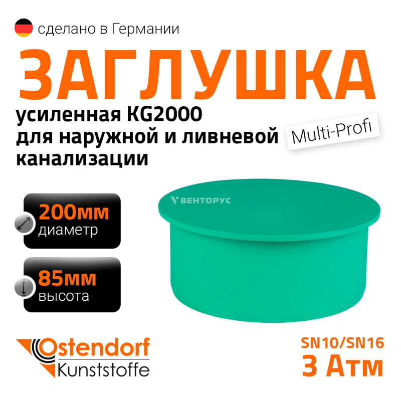 Заглушка для труб усиленной наружной канализации Ostendorf KG2000M диаметром 200 мм. Предназначена для перекрытия потока транспортируемой жидкости в канализационных трубопроводах. Цвет зеленый RAL 6017.