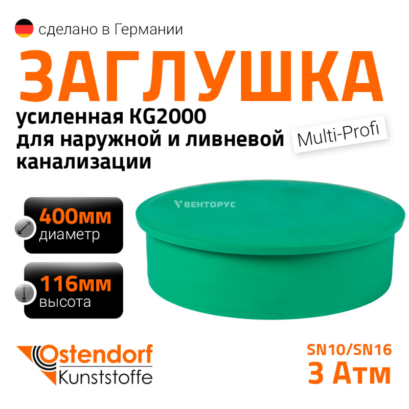 Заглушка для труб усиленной наружной канализации Ostendorf KG2000M диаметром 400 мм. Предназначена для перекрытия потока транспортируемой жидкости в канализационных трубопроводах. Цвет зеленый RAL 6017.