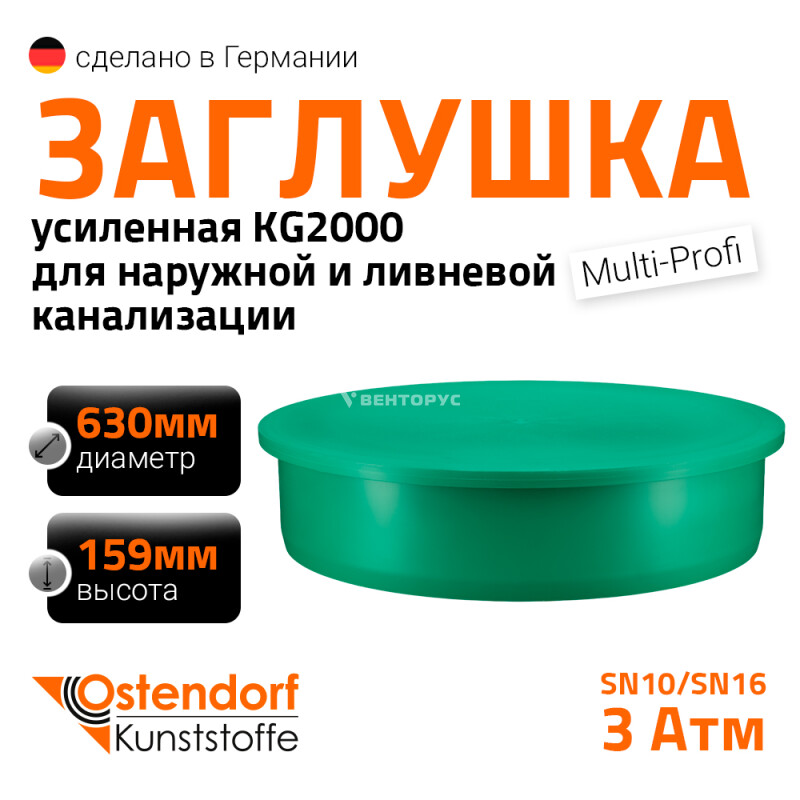 Заглушка для труб усиленной наружной канализации Ostendorf KG2000M диаметром 630 мм. Предназначена для перекрытия потока транспортируемой жидкости в канализационных трубопроводах. Цвет зеленый RAL 6017.