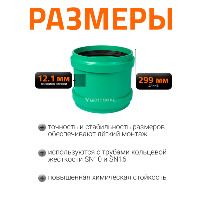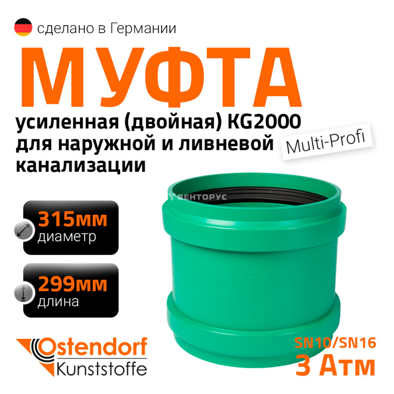 Муфта двойная двухраструбная для усиленной наружной канализации марки Ostendorf KG2000MM диаметром 315 мм. Предназначена для соединения канализационных труб, когда необходимо соединить две трубы не имеющих раструб или в случае их ремонта. Цвет зеленый RAL 6017.