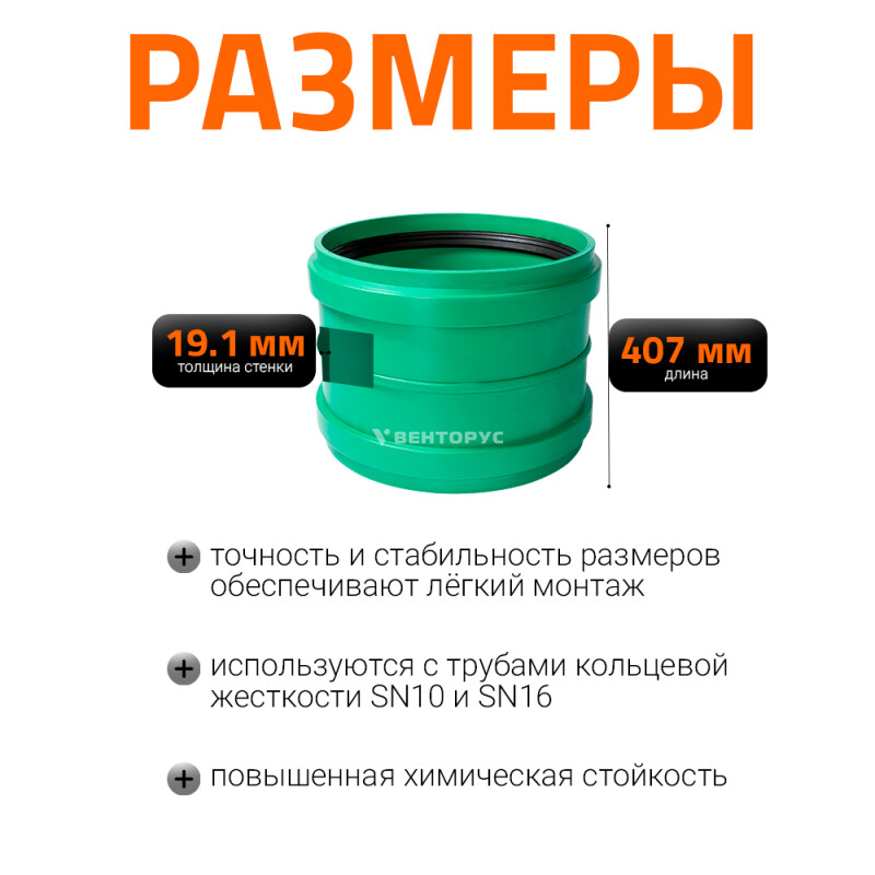 Муфта двойная двухраструбная для усиленной наружной канализации марки Ostendorf KG2000MM диаметром 500 мм. Предназначена для соединения канализационных труб, когда необходимо соединить две трубы не имеющих раструб или в случае их ремонта. Цвет зеленый RAL 6017.