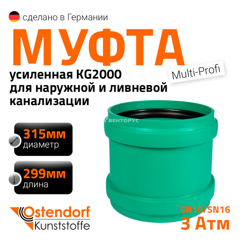Муфта ремонтная надвижная для усиленной наружной канализации марки Ostendorf KG2000U диаметром 315 мм. Предназначена для соединения труб в местах, где по ряду причин, используются трубы без раструба. Это может быть в местах разрыва трубопровода из-за неосторожного использования инженерной техники, или из-за смещения пластов земной коры, приведших к разрушению целостности существующего трубопровода безнапорной канализации где необходимо вырезать часть поврежденной трубы и вставить кусок ремонтной трубы, которая и будет крепится при помощью муфт. Цвет зеленый RAL 6017.