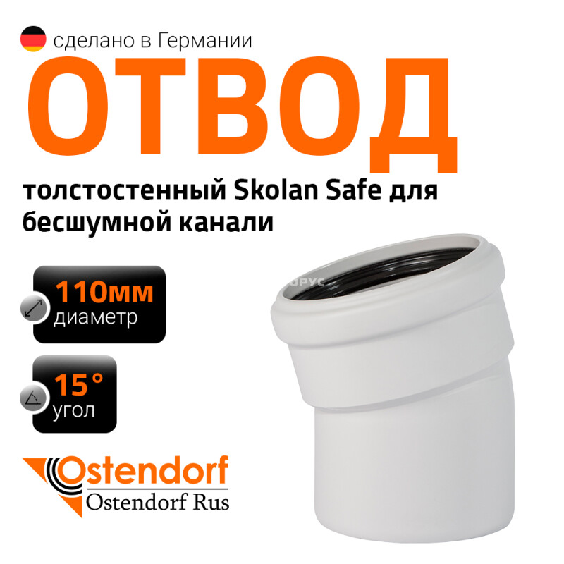 Канализационный отвод бесшумной системы Ostendorf Skolan Safe SKB диаметром 110 мм изготовленный под углом 15°. Предназначен для организации поворота элементов системы трубопроводов во внутренней канализации.
