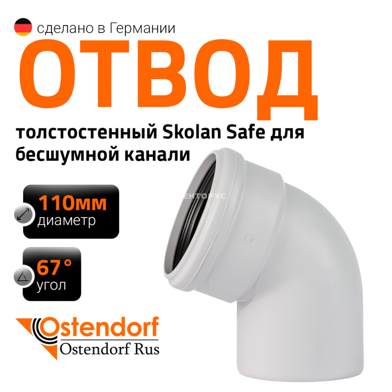 Канализационный отвод бесшумной системы Ostendorf Skolan Safe SKB диаметром 110 мм изготовленный под углом 67°. Предназначен для организации поворота элементов системы трубопроводов во внутренней канализации.