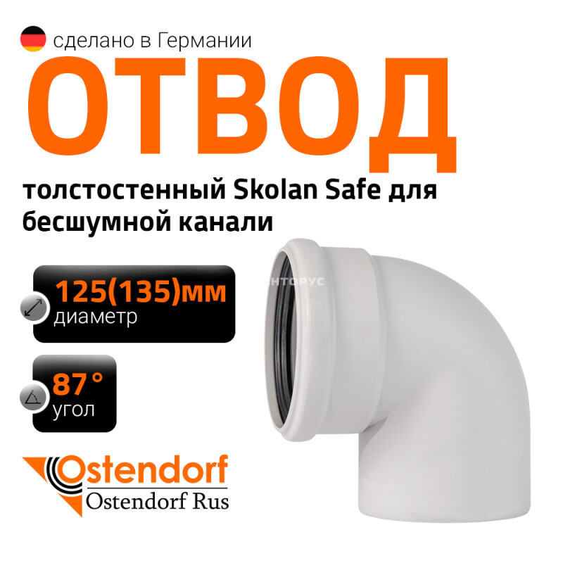 Канализационный отвод бесшумной системы Ostendorf Skolan Safe SKB диаметром 125 мм изготовленный под углом 87°. Предназначен для организации поворота элементов системы трубопроводов во внутренней канализации.