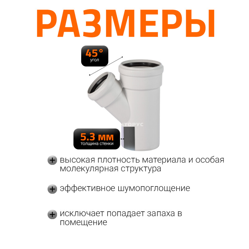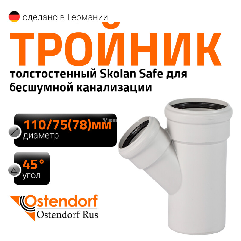 Тройник для внутренней бесшумной канализации Ostendorf Skolan Safe SKEA изготовленный под углом 45° диаметром 110x75 мм. Предназначен для монтажа разветвления трубопроводов в системах канализации внутри жилых, административных, производственных зданий, транспортирующих хозяйственно-фекальные стоки.