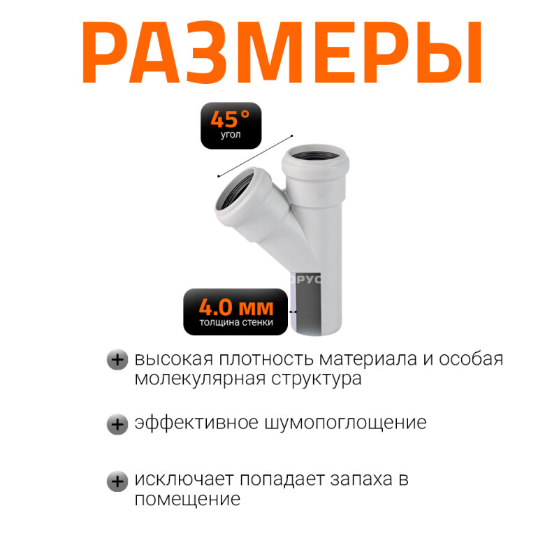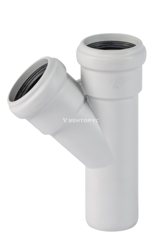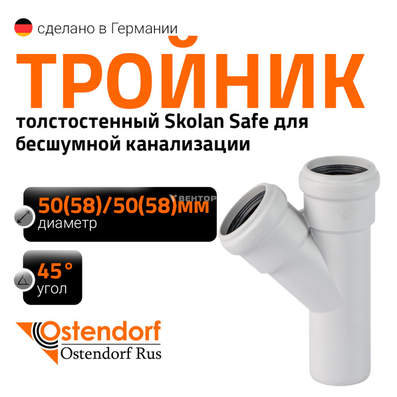 Тройник для внутренней бесшумной канализации Ostendorf Skolan Safe SKEA изготовленный под углом 45° диаметром 50x50 мм. Предназначен для монтажа разветвления трубопроводов в системах канализации внутри жилых, административных, производственных зданий, транспортирующих хозяйственно-фекальные стоки.