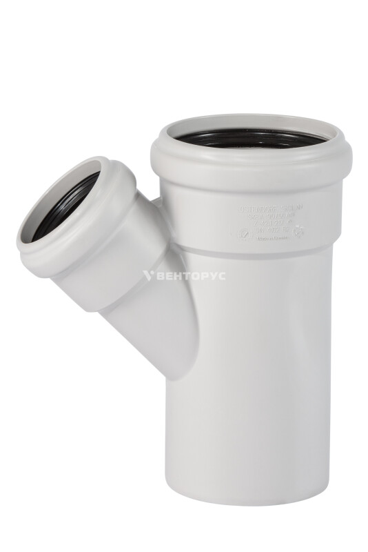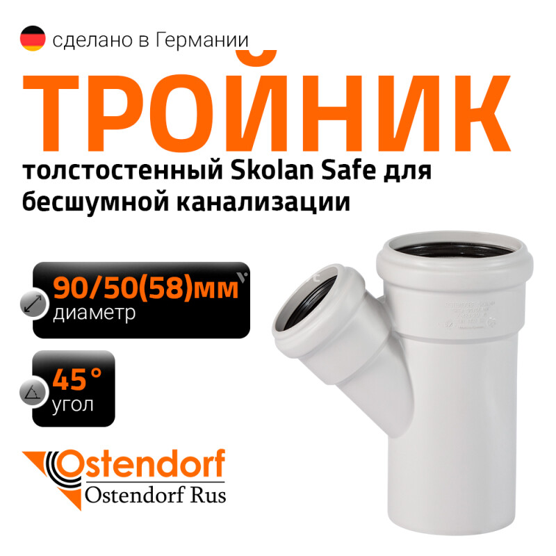 Тройник для внутренней бесшумной канализации Ostendorf Skolan Safe SKEA изготовленный под углом 45° диаметром 90x50 мм. Предназначен для монтажа разветвления трубопроводов в системах канализации внутри жилых, административных, производственных зданий, транспортирующих хозяйственно-фекальные стоки.