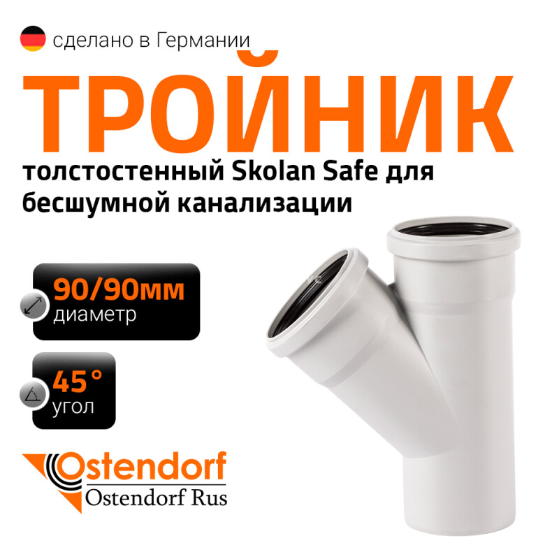 Тройник для внутренней бесшумной канализации Ostendorf Skolan Safe SKEA изготовленный под углом 45° диаметром 90x90 мм. Предназначен для монтажа разветвления трубопроводов в системах канализации внутри жилых, административных, производственных зданий, транспортирующих хозяйственно-фекальные стоки.