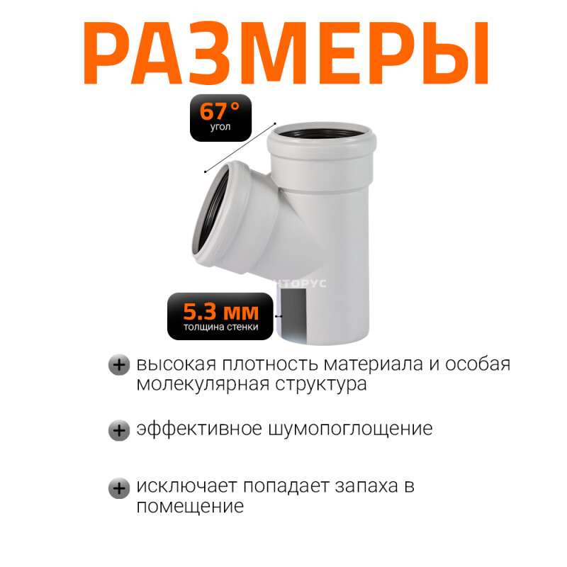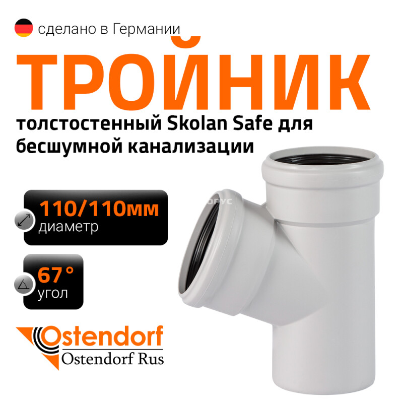 Тройник для внутренней бесшумной канализации Ostendorf Skolan Safe SKEA изготовленный под углом 67° диаметром 110x110 мм. Предназначен для монтажа разветвления трубопроводов в системах канализации внутри жилых, административных, производственных зданий, транспортирующих хозяйственно-фекальные стоки.
