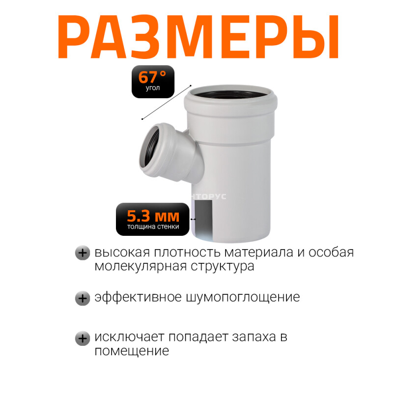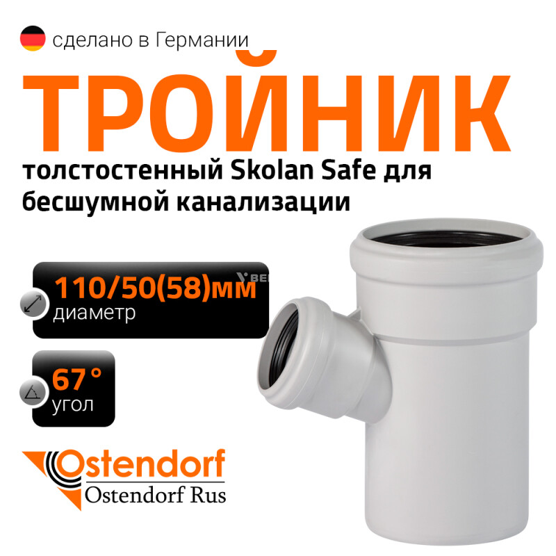 Тройник для внутренней бесшумной канализации Ostendorf Skolan Safe SKEA изготовленный под углом 67° диаметром 110x50 мм. Предназначен для монтажа разветвления трубопроводов в системах канализации внутри жилых, административных, производственных зданий, транспортирующих хозяйственно-фекальные стоки.