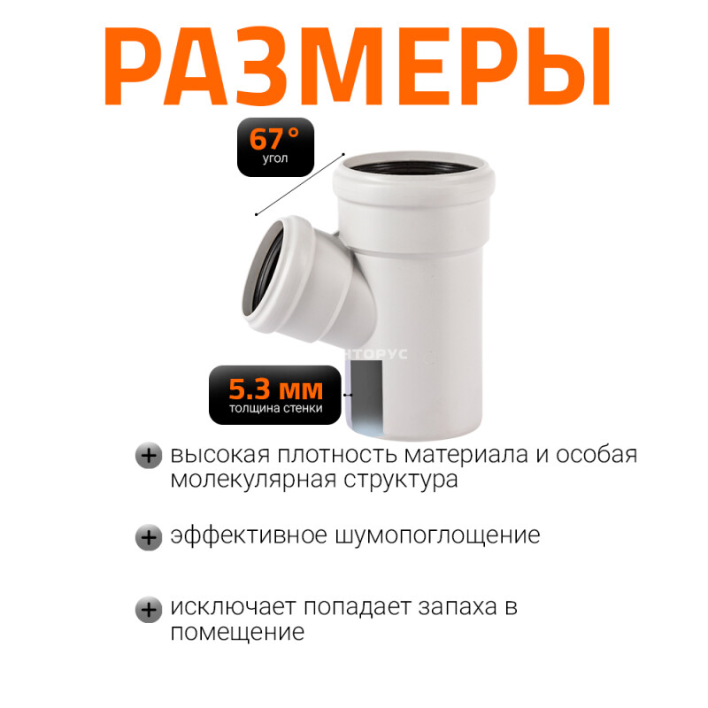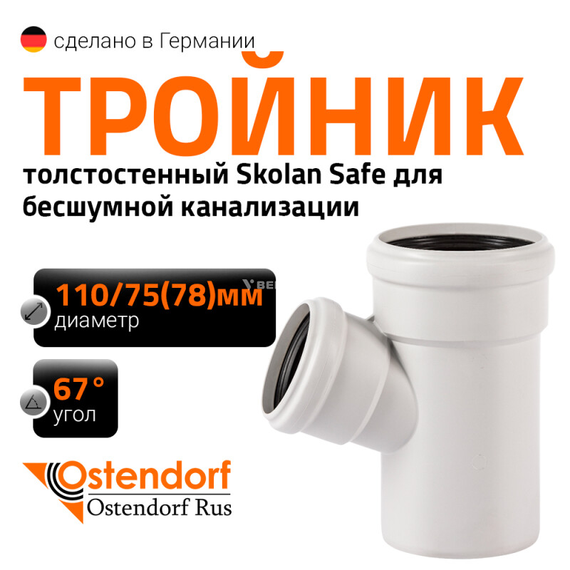 Тройник для внутренней бесшумной канализации Ostendorf Skolan Safe SKEA изготовленный под углом 67° диаметром 110x75 мм. Предназначен для монтажа разветвления трубопроводов в системах канализации внутри жилых, административных, производственных зданий, транспортирующих хозяйственно-фекальные стоки.