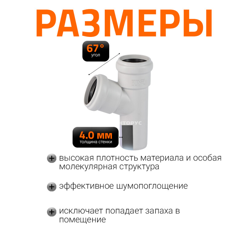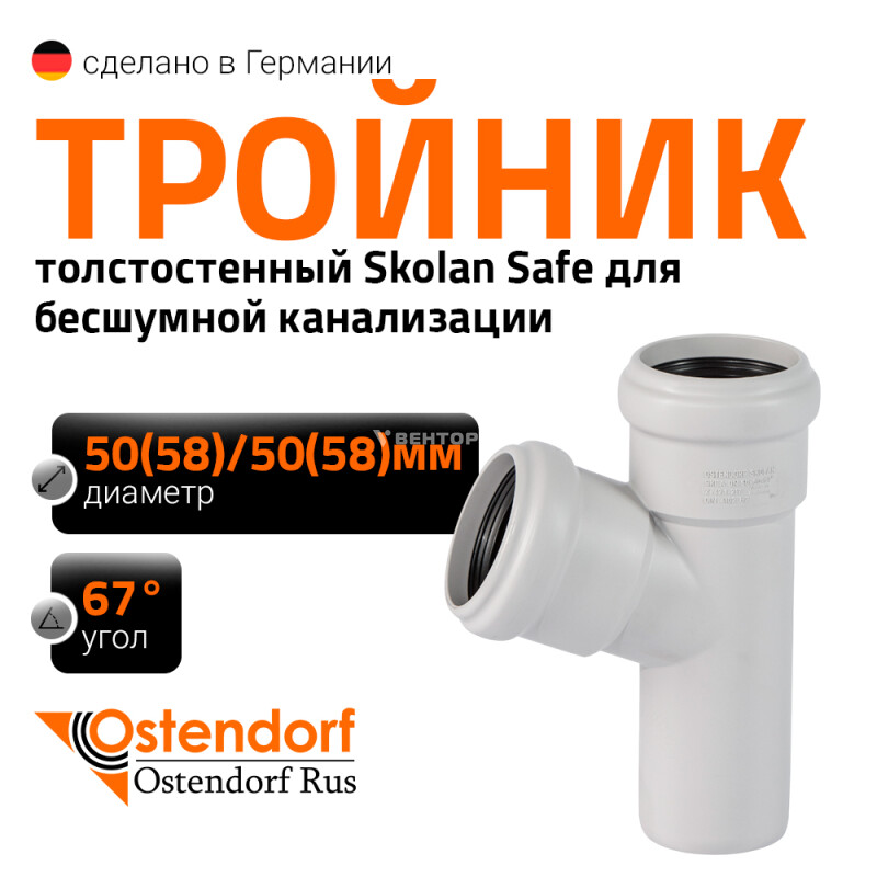 Тройник для внутренней бесшумной канализации Ostendorf Skolan Safe SKEA изготовленный под углом 67° диаметром 50x50 мм. Предназначен для монтажа разветвления трубопроводов в системах канализации внутри жилых, административных, производственных зданий, транспортирующих хозяйственно-фекальные стоки.