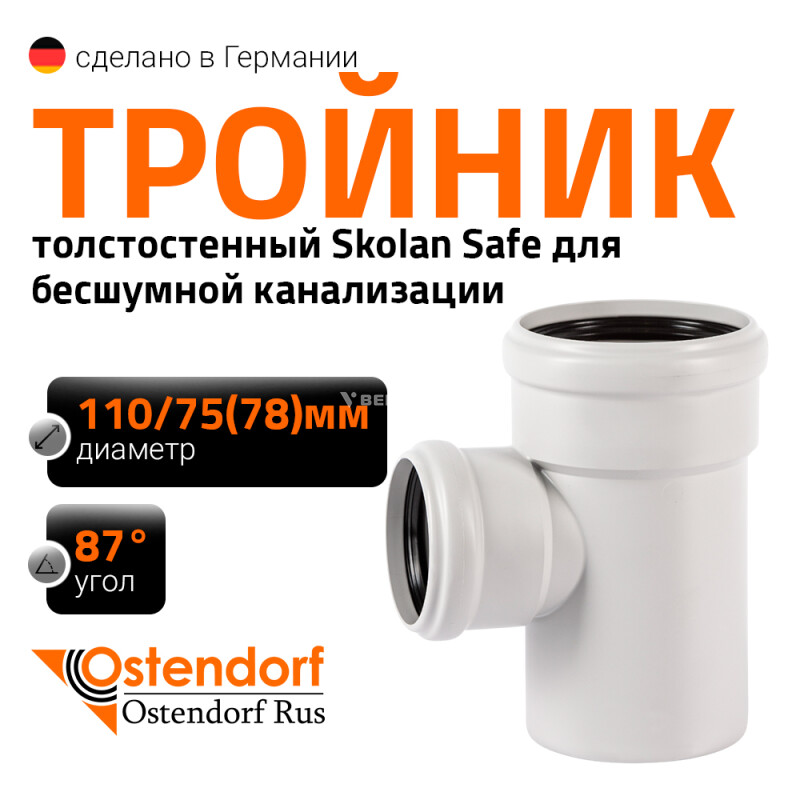 Тройник для внутренней бесшумной канализации Ostendorf Skolan Safe SKEA изготовленный под углом 87° диаметром 110x75 мм. Предназначен для монтажа разветвления трубопроводов в системах канализации внутри жилых, административных, производственных зданий, транспортирующих хозяйственно-фекальные стоки.