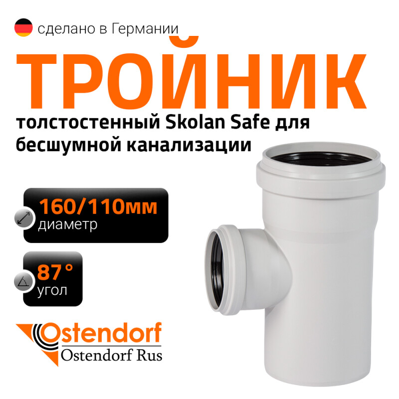 Тройник для внутренней бесшумной канализации Ostendorf Skolan Safe SKEA изготовленный под углом 87° диаметром 160x110 мм. Предназначен для монтажа разветвления трубопроводов в системах канализации внутри жилых, административных, производственных зданий, транспортирующих хозяйственно-фекальные стоки.