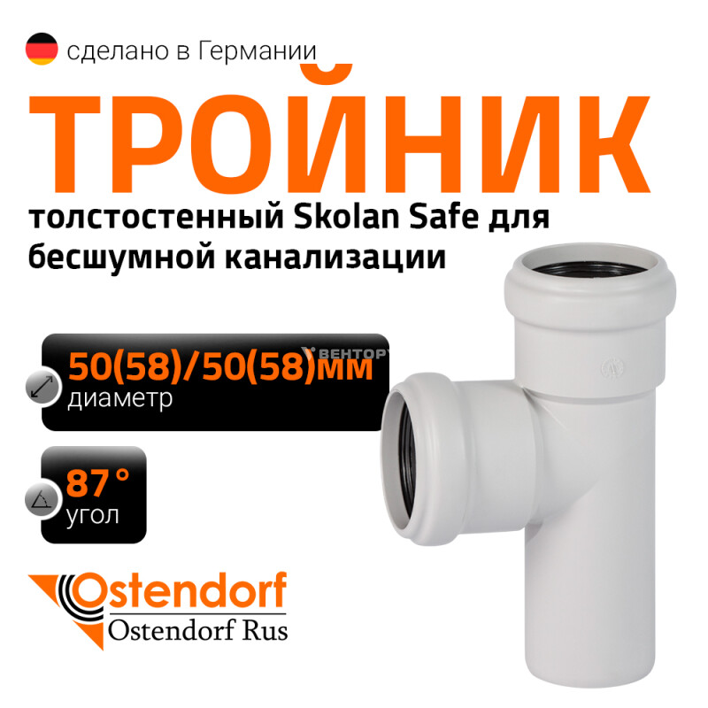 Тройник для внутренней бесшумной канализации Ostendorf Skolan Safe SKEA изготовленный под углом 87° диаметром 50x50 мм. Предназначен для монтажа разветвления трубопроводов в системах канализации внутри жилых, административных, производственных зданий, транспортирующих хозяйственно-фекальные стоки.