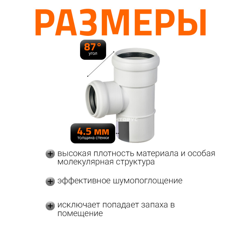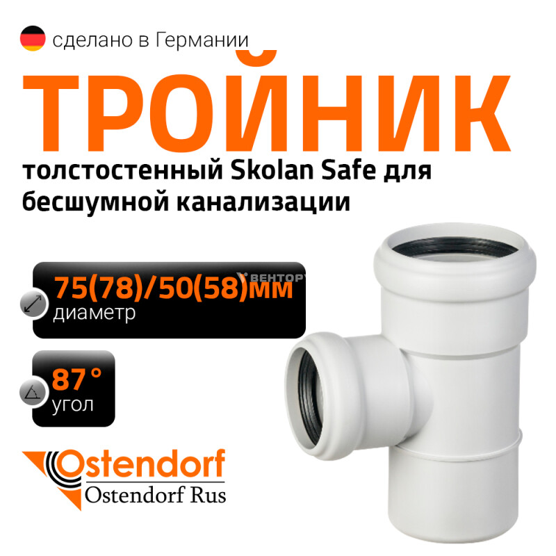 Тройник для внутренней бесшумной канализации Ostendorf Skolan Safe SKEA изготовленный под углом 87° диаметром 75x50 мм. Предназначен для монтажа разветвления трубопроводов в системах канализации внутри жилых, административных, производственных зданий, транспортирующих хозяйственно-фекальные стоки.