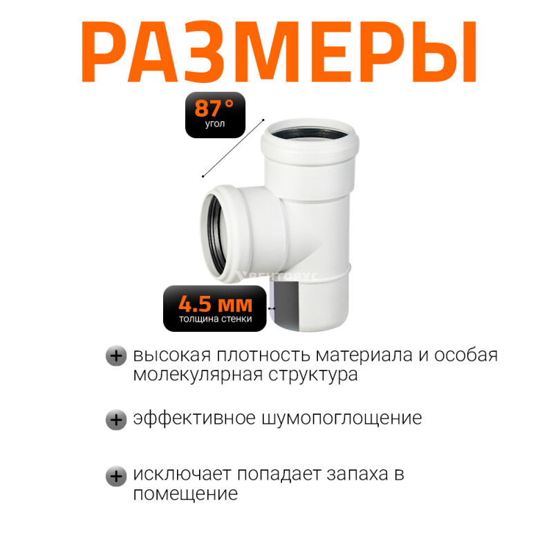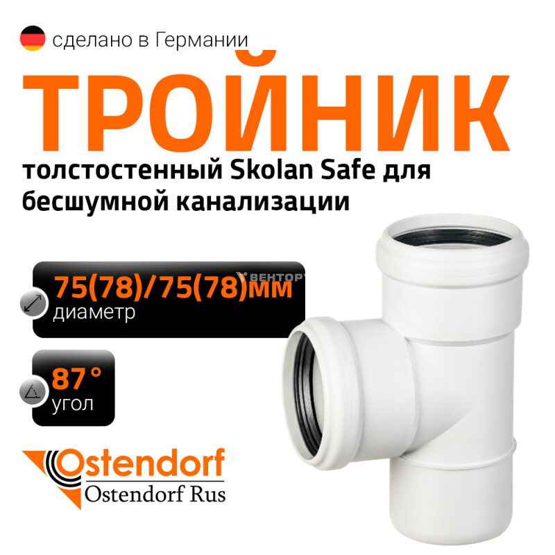 Тройник для внутренней бесшумной канализации Ostendorf Skolan Safe SKEA изготовленный под углом 87° диаметром 75x75 мм. Предназначен для монтажа разветвления трубопроводов в системах канализации внутри жилых, административных, производственных зданий, транспортирующих хозяйственно-фекальные стоки.