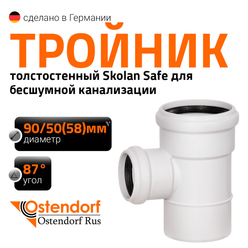 Тройник для внутренней бесшумной канализации Ostendorf Skolan Safe SKEA изготовленный под углом 87° диаметром 90x50 мм. Предназначен для монтажа разветвления трубопроводов в системах канализации внутри жилых, административных, производственных зданий, транспортирующих хозяйственно-фекальные стоки.