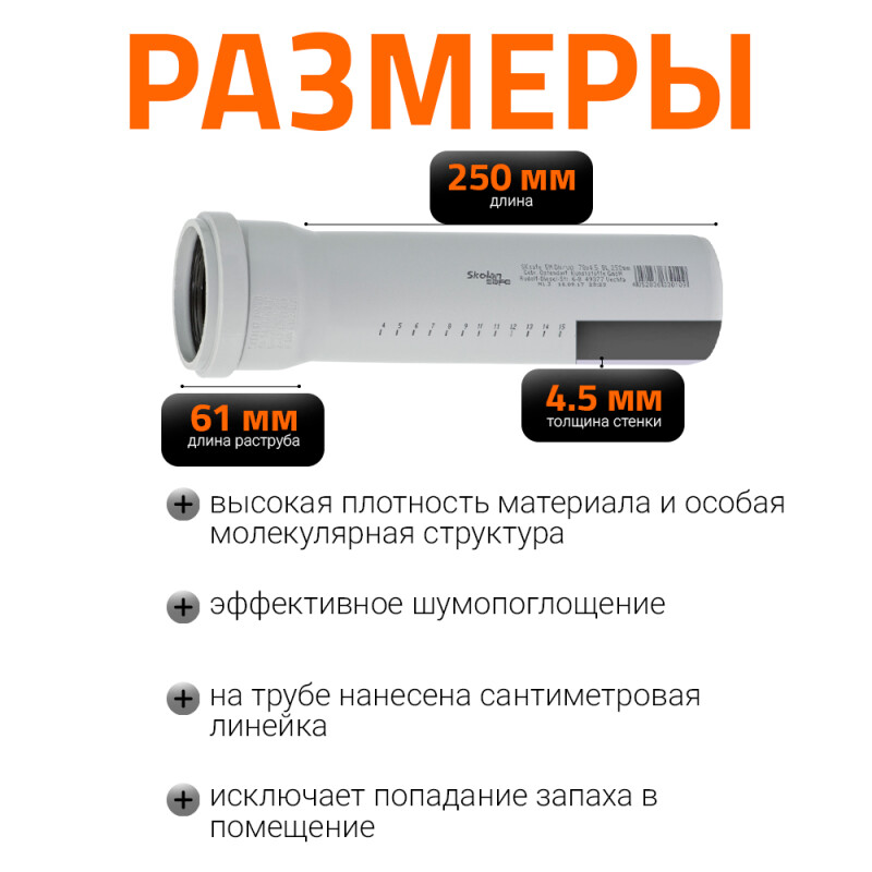 Труба для внутренней бесшумной канализации Ostendorf Skolan Safe номинальным диаметром 75 мм, толщиной стенки 4,5 мм и длиной 250 мм. Предназначена для внутренней разводки в системах хозяйственно-бытовой канализация внутри жилых, административных и промышленных зданиях, а также для систем внутренних водостоков. Толстые стенки труб Skolan Safe обеспечивают тишину и комфорт в помещении. Благодаря этому ее разрешено применять во всех отраслях высотного строительства. Кольцевая жесткость SN16. Степень звукоизоляции III - 17 Дб. Химическая стойкость для агрессивных сред в диапазоне от pH 2 до pH 12. Выдерживаемое давление системы 2 Атм. Выдерживаемая температура стоков 90 °C. Широкий ассортимент шумопоглощающих канализационных труб Ostendorf Skolan Safe по доступным ценам, в наличии и под заказ.