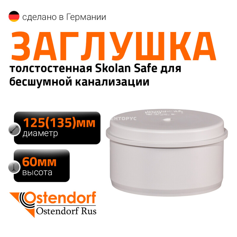 Заглушка для внутренней бесшумной канализации Ostendorf SKM диаметром 125 мм. Предназначена для перекрытия потока транспортируемой жидкости в канализационных трубопроводах. Цвет белый.