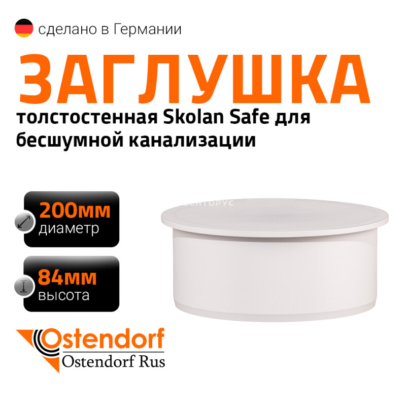 Заглушка для внутренней бесшумной канализации Ostendorf SKM диаметром 200 мм. Предназначена для перекрытия потока транспортируемой жидкости в канализационных трубопроводах. Цвет белый.