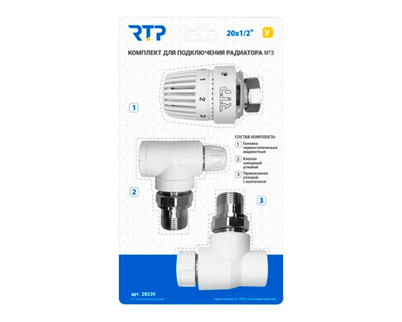 RTP Комплект №3 (Термостатический клапан угловой с колпачком, клапан запорный угловой, термостатическая головка) PP-R 20х1/2"