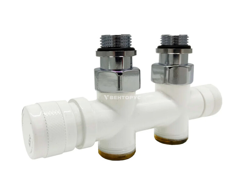 Серия "Tondera". Прямой узел для нижнего подключения отопительных приборов. Вентиль ручной регулировки, преобразуемый в термостатический, оснащён встроенным устройством для предварительной настройки пропускной способности и запорный клапан. Резьбовые соединения для медных и многослойных труб - 3/4”E, разъёмные соединения - 1/2” с уплотнительными кольцами. Межосевое расстояние - 50 мм. Покрытие - Белый Ral 9016.