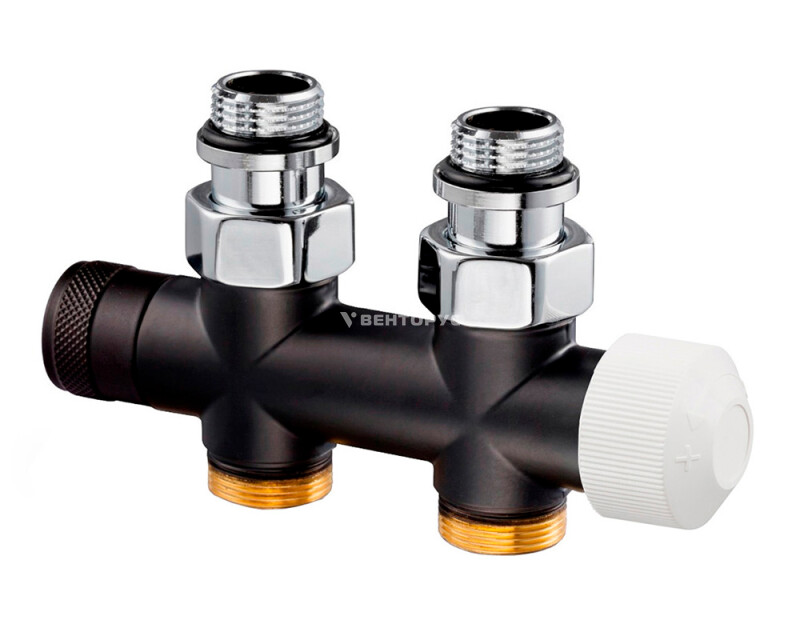 Серия "Tondera". Прямой узел для нижнего подключения отопительных приборов. Вентиль термостатический, оснащён встроенным устройством для предварительной настройки пропускной способности и запорный клапан. Резьбовые соединения для медных и многослойных труб - 3/4”E, разъёмные соединения - 1/2” с уплотнительными кольцами. Межосевое расстояние - 50 мм. Покрытие - Чёрный матовый.