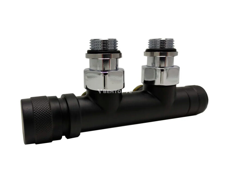 Серия "Tondera". Угловой узел для нижнего подключения отопительных приборов, подача слева. Вентиль ручной регулировки, преобразуемый в термостатический, оснащён встроенным устройством для предварительной настройки пропускной способности и запорный клапан. Резьбовые соединения для медных и многослойных труб - 3/4”E, разъёмные соединения - 1/2” с уплотнительными кольцами. Межосевое расстояние - 50 мм. Покрытие - Чёрный матовый.