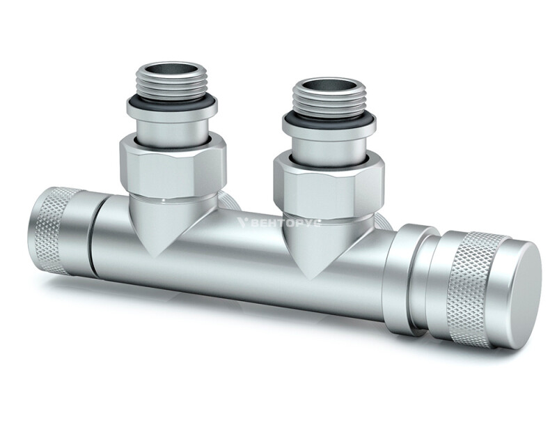 Серия "Tondera". Угловой узел для нижнего подключения отопительных приборов, подача справа. Вентиль ручной регулировки, преобразуемый в термостатический, оснащён встроенным устройством для предварительной настройки пропускной способности и запорный клапан. Резьбовые соединения для медных и многослойных труб - 3/4”E, разъёмные соединения - 1/2” с уплотнительными кольцами. Межосевое расстояние - 50 мм. Покрытие - Хром матовый.